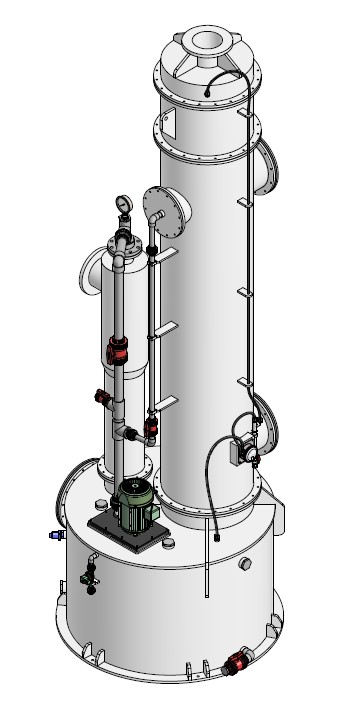 An Apollo 500 air scrubber was chosen for this application due to it having a large recirculation tank (200 gallons) and two scrubbing stages – an ejector-venturi and packed tower. The ejector venturi part of the air scrubber removes 90% of the HCl and dissipates most of the Heat of Reaction generated when the HCl is neutralized by the NaOH, while also inducing air flow by creating a suction draft. The packed tower portion of the air scrubber, containing an extended 7 ft. tall packing bed and 2-stage high efficiency mist eliminator, achieves the remaining 99.9% removal of HCl. The air scrubber was constructed from FRP and had a double-wall, insulated tank with an electric heater and Mill & Chem Duty recirculation pump motor. The AAT Apollo 500 air scrubber system was installed in august 2010 and has been operating satisfactorily ever since.